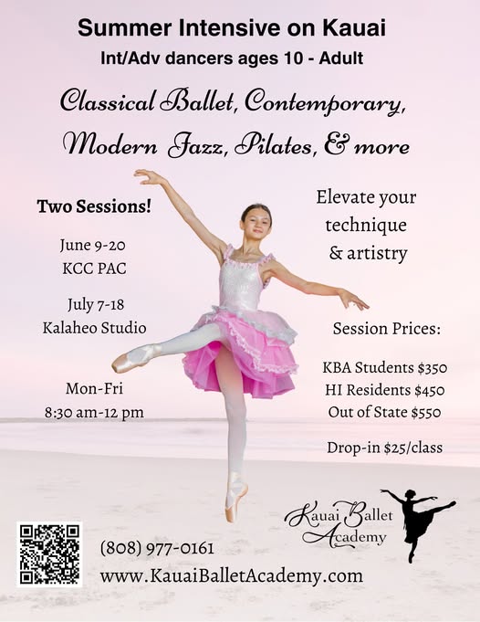 Join us on the beautiful Garden Island of Kauai for a summer intensive to remember. Improve your ballet technique, strength, and flexibility through barre, center, Pilates, and conditioning exercises. Learn ballet history, classical repertoire, jazz, modern, and contemporary ballet throughout the intensive. Each day will begin with a 90-minute technique class taught by Master teacher, Miss Sara Day, followed by classes that will change daily. For more information contact us at 808-977-0161
