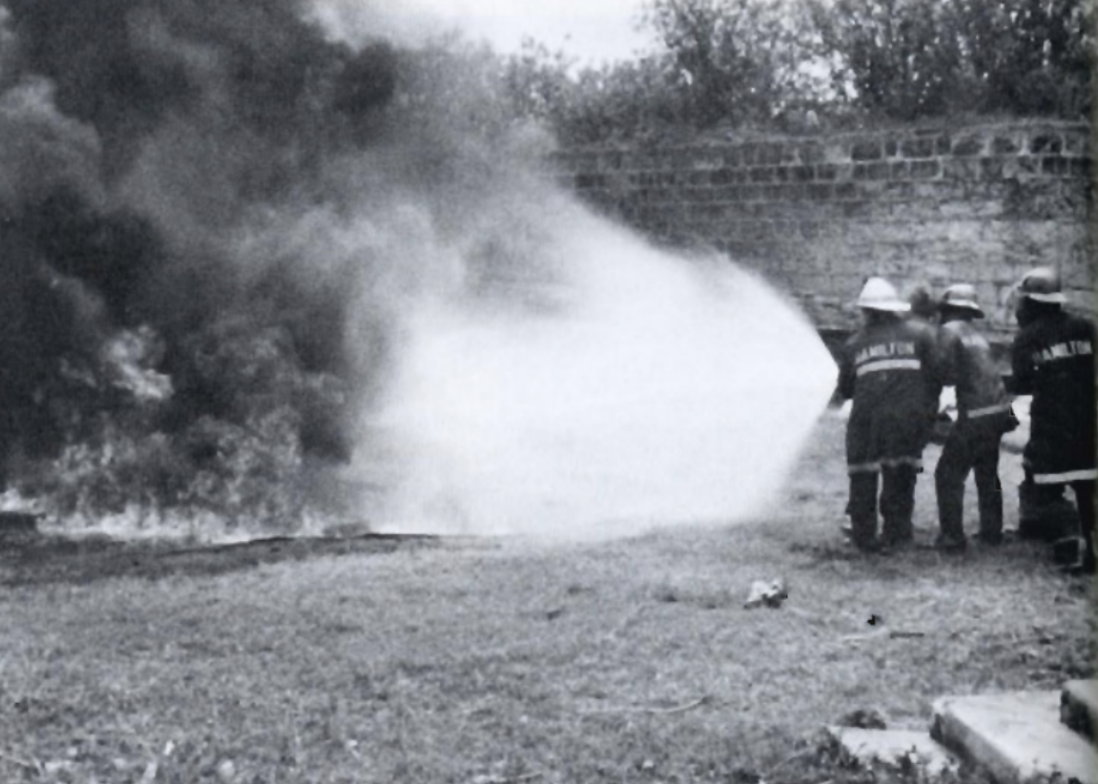 | | Mariners at SCI’s nautical school, practicing safe entry procedures, including testing for flammable gases. | | Here, officers practice firefighting in a 1983 SCI training held in Bermuda. | | |