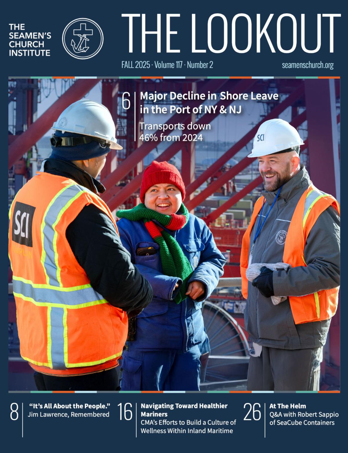 This issue features a report on the 46% decline in seafarer shore leave in the Port of New York and New Jersey, a remembrance of longtime Trustee Jim Lawrence, five years of chaplaincy aboard SUNY Maritime’s Summer Sea Term, updates from the Center for Maritime Education and Center for Mariner Advocacy, reflections on the SS El Faro’s tenth anniversary and SCI's longstanding presence amidst maritime disasters, and more.