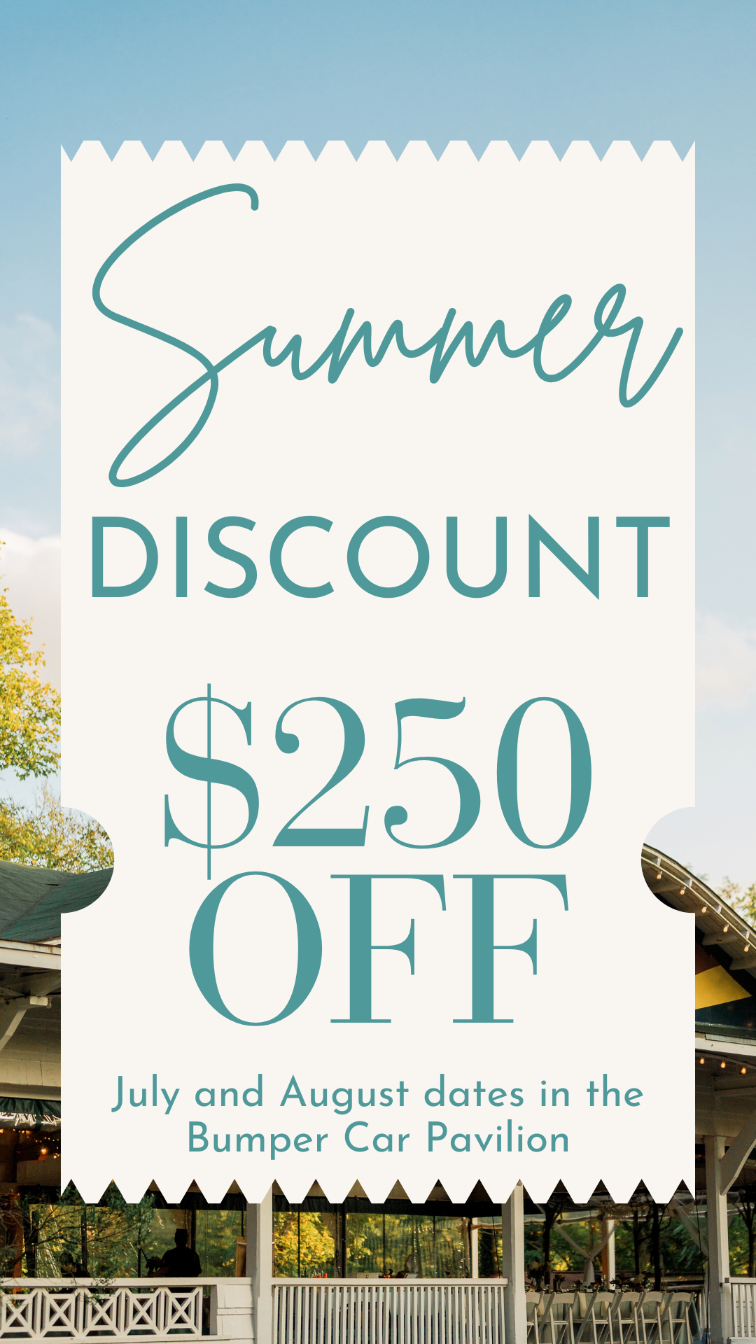 | Planning a wedding, corporate gathering, or birthday celebration in Summer 2026? Many great dates are still available! Book a private rental in the Bumper Car Pavilion any available date between July 1, 2026 - August 31, 2026 and mention the code [Summer2026] to receive $250 off. View the Venue Availability Calendar >> | |