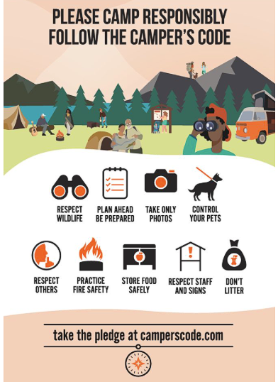 The Camper’s Code is a collaborative campaign started in 2021 by a dozen organizations across the camping sector in British Columbia who believe deeply in the responsibility of every single person to create a safe, enjoyable, respectful camping experience for all—people, wildlife, and nature, too.