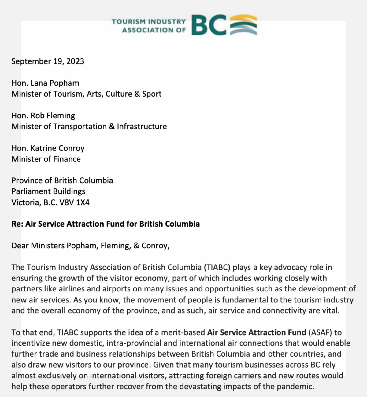 Earlier this week, TIABC submitted a letter to Hon. Lana Popham, Minister of Tourism, Arts, Culture & Sport,