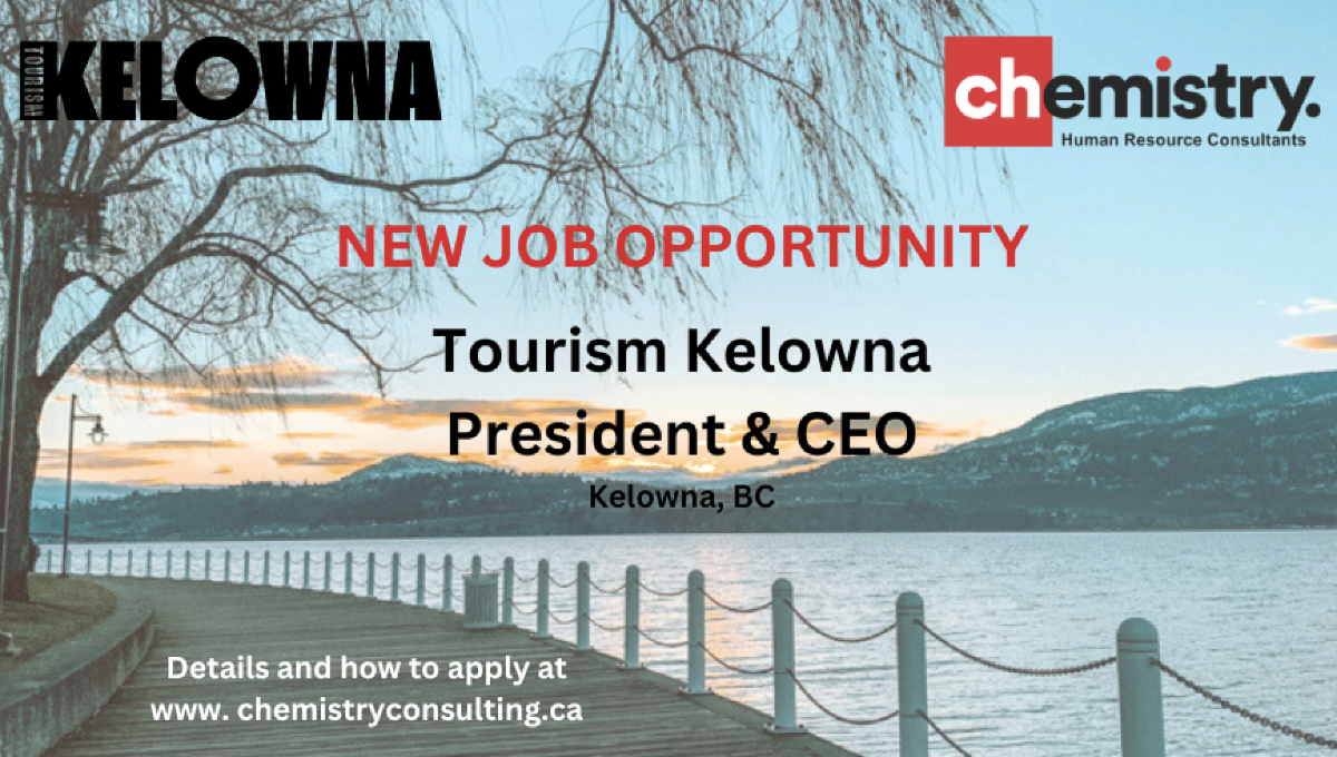 Chemistry Consulting Group is conducting the search for the next President & CEO of Tourism Kelowna — and this is a standout, career-defining leadershiopportunity. Kelowna and the Central Okanagan are thriving — world-class wine, year-round adventure, a booming visitor economy, and limitless potential. Now it’s time for bold leadership to take it even further.
