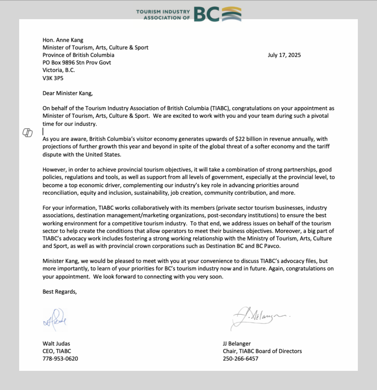 TIABC looks forward to working collaboratively with Minister Kang and her team during this important period for BC's tourism industry. We have extended an invitation to meet with the Minister to discuss TIABC's current advocacy priorities and to gain insight into the Ministry's vision and objectives for the sector, both now and into the future.