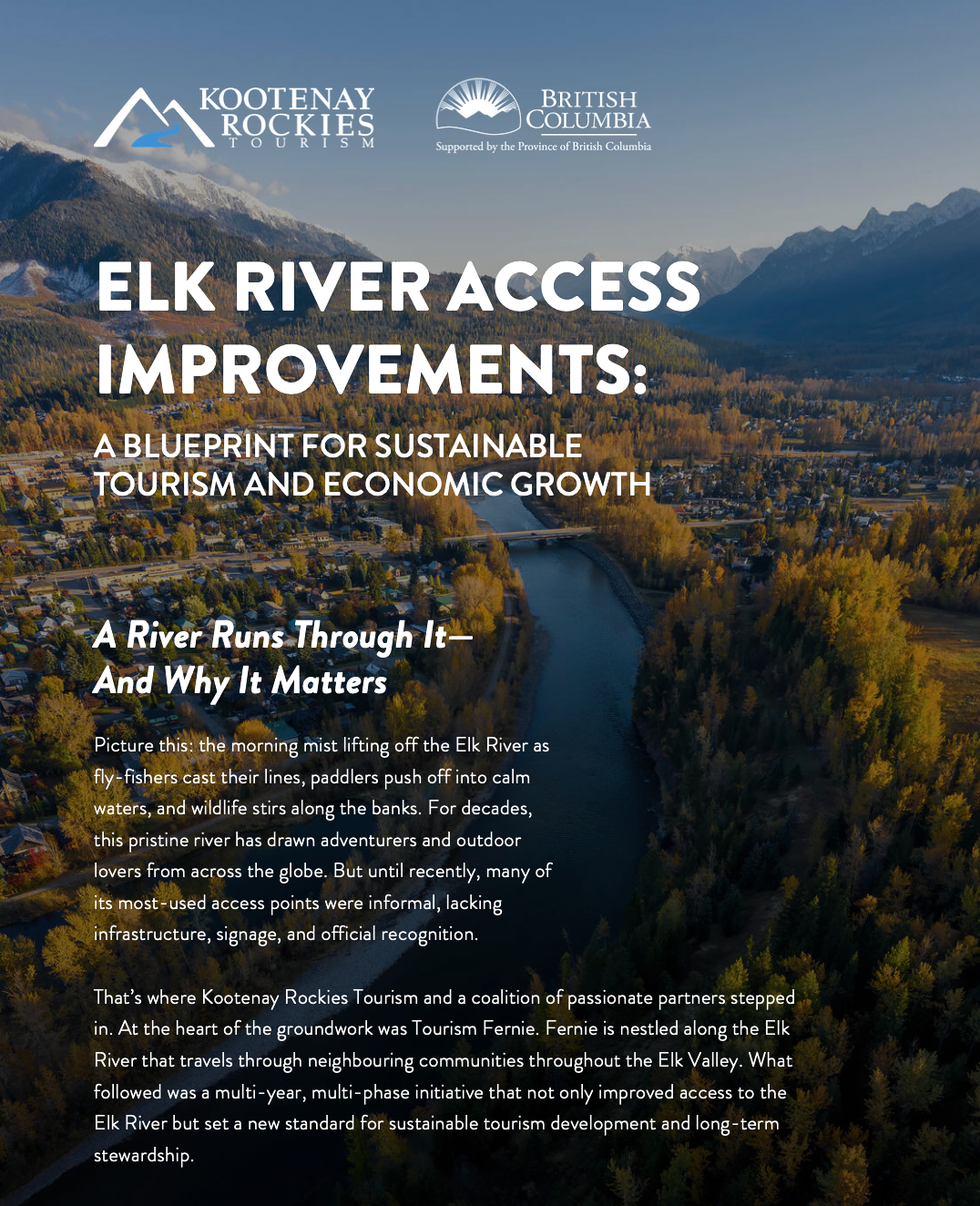 Kootenay Rockies Tourism identified a set of high-impact infrastructure projects that could help accelerate destination development, create jobs, and strengthen the tourism economy using this funding stream - the Elk River access improvements rose to the top of the list.