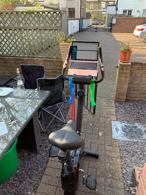 Put the work in workout. GYB member Susan Kabani found a social distancing workout method that goes well with checking emails. Now presenting, the