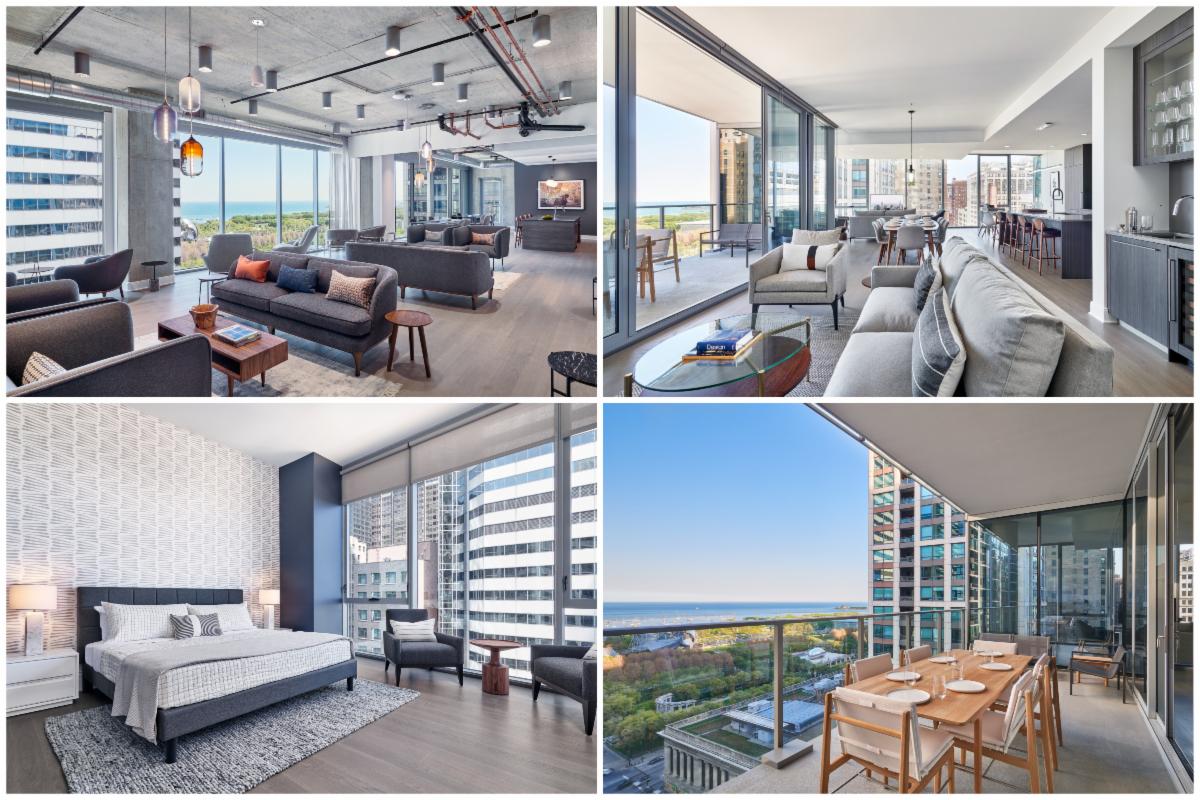 Clockwise from top left: Parkline Chicago offers Penthouse Collection residents a private amenity floor; a model apartment showcases the Penthouse Collection’s large, gracious floor plans and condo-quality finishes; expansive terraces offer sweeping views; and primary bedrooms have large walk-in closets and spa baths.