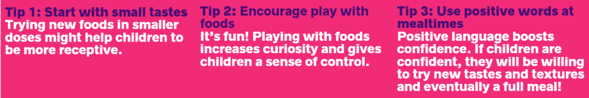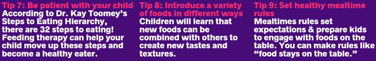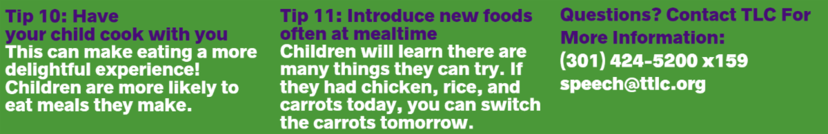 TLC offers feeding therapy services for children of all ages. Our goal is to make mealtimes enjoyable for families including those with children who are picky eaters. We strive to promote healthy eating habits. Here are some tips to make mealtimes more fun and productive.