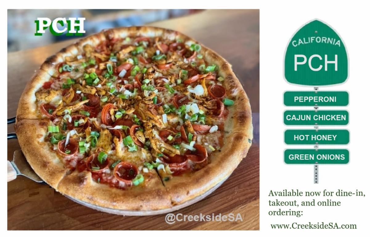 Get on the PCH, our new pizza on the Creekside menu. P: Pepperoni, C: Cajun-spiced Chicken, H: Hot Honey, plus some green onions for a little color and pop. Named for our favorite California coastal highway, PCH is available now for dine-in, takeout, and online ordering. Treat yourself to Lunch, Happy Hour, and Dinner at Creekside Pizza & Taproom. To order online (starting at 12 Noon daily) CLICK HERE