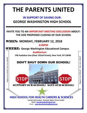 El plan del Departamento de Educación de la Ciudad de Nueva York (DOE) de cerrar la Escuela Secundaria de Carreras de Salud y Ciencias en el Campus Educativo George Washington NO es lo mejor para los estudiantes, padres y nuestra comunidad.
