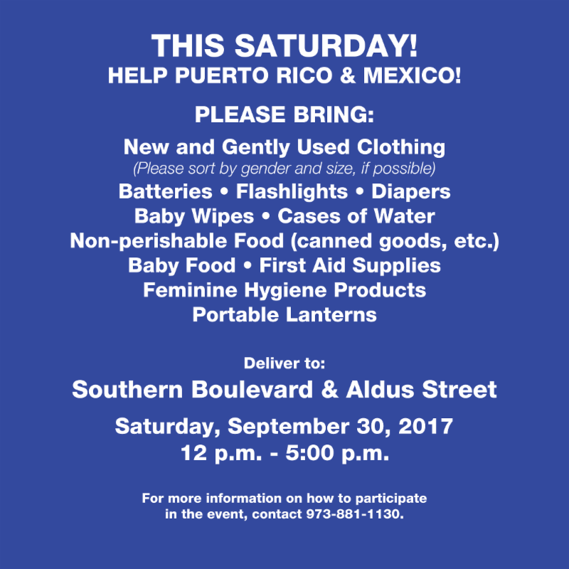 The drive will take place TOMORROW Saturday, September 30, 2017 at the corner of Southern Boulevard and Aldus Street. Bronx, NY. The event will begin at 12:00pm noon. Donations including clothing, non-perishable food and other goods will be accepted by the New York Hispanic Clergy Organization at the event.