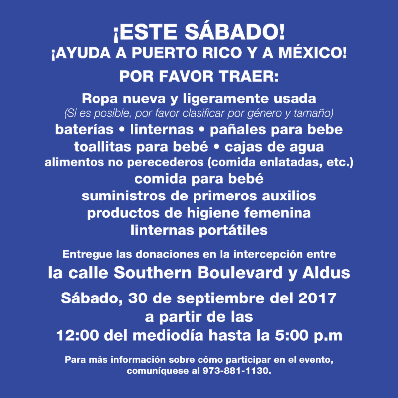 El evento se llevará a cabo MAÑANA Sábado 30 de Septiembre de 2017 en la esquina de Southern Boulevard y Aldus Street. Bronx, NY. El evento comenzará a las 12:00pm del mediodía. Las donaciones incluyendo ropa, alimentos no perecederos y otros bienes serán aceptados por la Organización de Clérigos Hispanos de Nueva York en el evento.