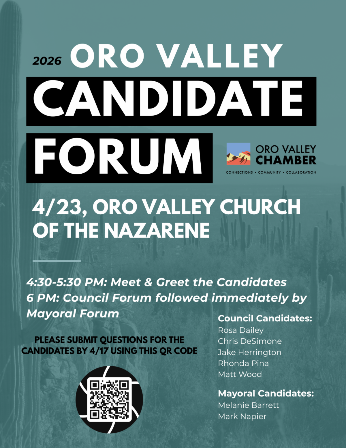 ------The Oro Valley Chamber will be hosting a candidate forum on April 23rd at Oro Valley Church of the Nazarene. The event is free and open to the public. In preparation for the event, we are asking that the public submit topics and questions that they would like discussed at the event. If you would like to contribute, please use this link. Submissions will close on the 17th.