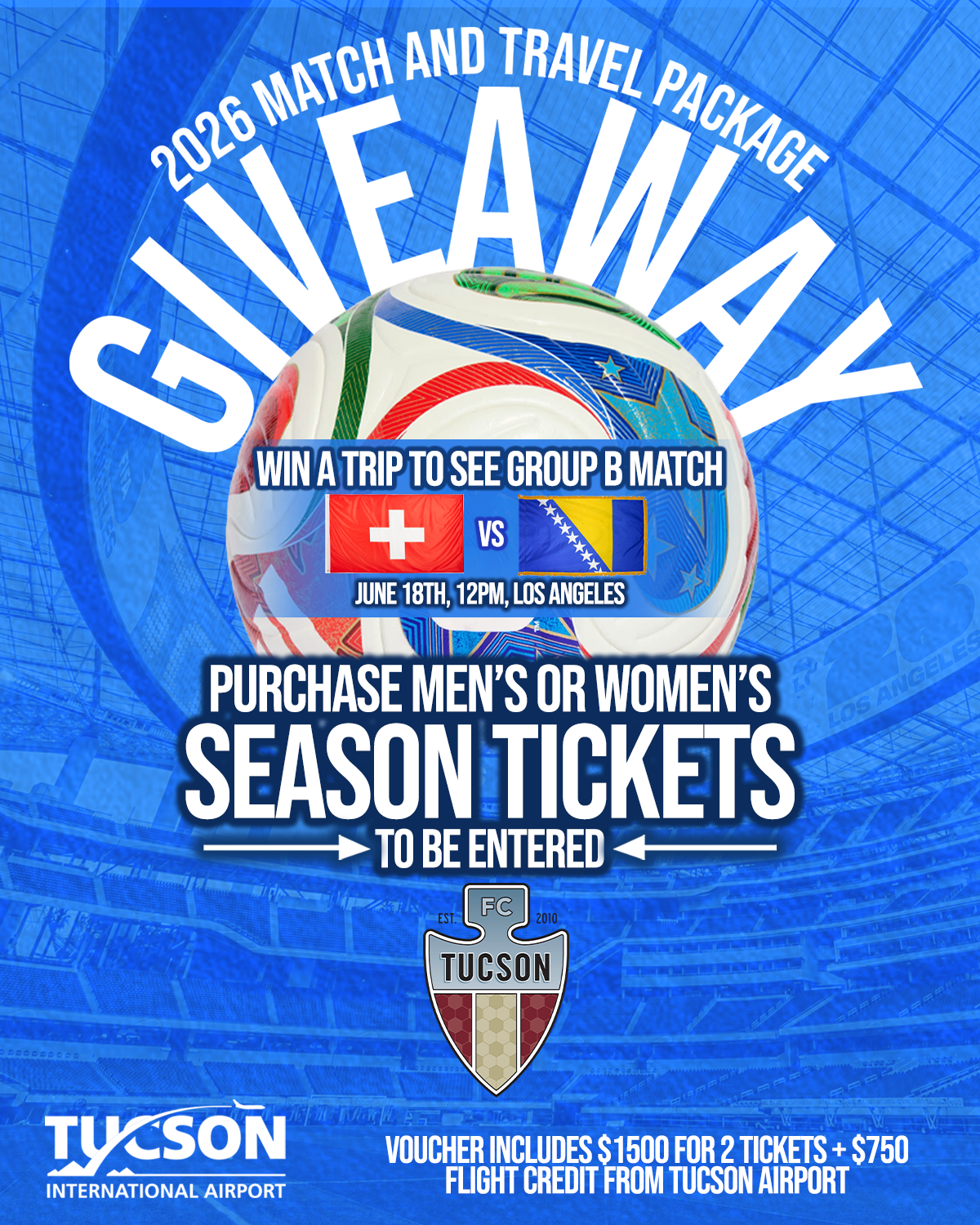 ------Soccer fans have plenty to celebrate as FC Tucson gears up for its 2026 season. The club has announced a high-stakes giveaway for a World Cup travel package. One lucky winner will receive a $1,500 voucher for two tickets to the June 18th match between Switzerland and Bosnia & Herzegovina, paired with a $750 flight credit from Tucson International Airport. Entry is simple: anyone who purchases a 2026 Men’s or Women’s Season Ticket package is automatically entered to win. Existing Season Ticket Members are already in the running, so keep an eye out for the upcoming draw for this once-in-a-lifetime experience.