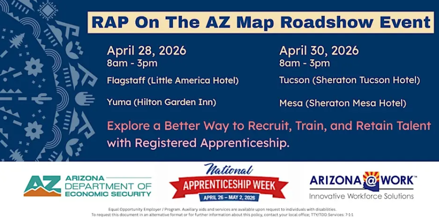 ------The RAP on the AZ Map Roadshow is a statewide series of one-day events held during National Apprenticeship Week. These symposium-style gatherings will connect employers, workforce professionals, educators, and community partners to learn more about Registered Apprenticeship Programs in Arizona and strengthen workforce partnerships across the state.