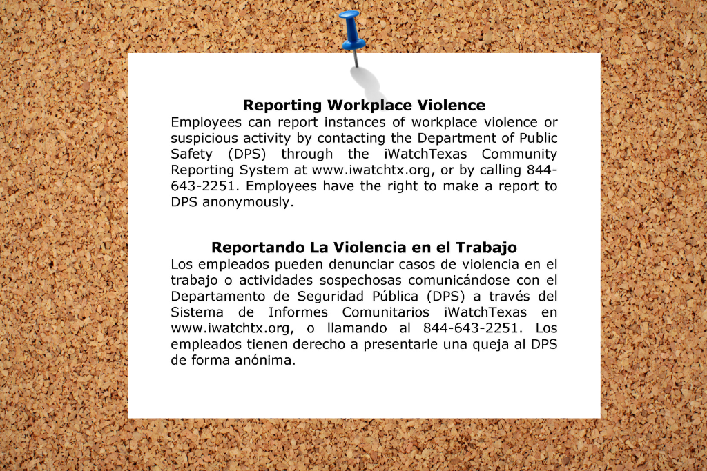 Mandating employer action: All Texas employers, regardless of size, must now post a notice informing employees about the hotline and their right to report workplace violence or suspicious activity.