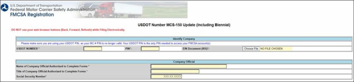 The link to request the safety audit has what appears to be a SAFER URL and mirrors FMCSA’s MC-150 but includes fields to enter a PIN#, EIN#, and Social Security Number.