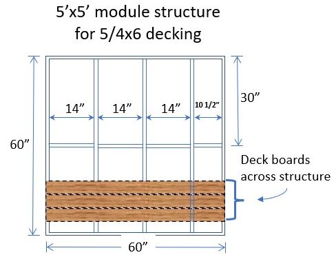 One Building Basics error identified by several readers has to do with the 5x5 module structure for plank decking. The corrected structure is shown below with one additional support board that was left out of the previous version of the document. Note this is just one of several ways to accomplish the necessary plank support, with the key being a maximum of 16 in. on center support for the 5/4 deck boards.
