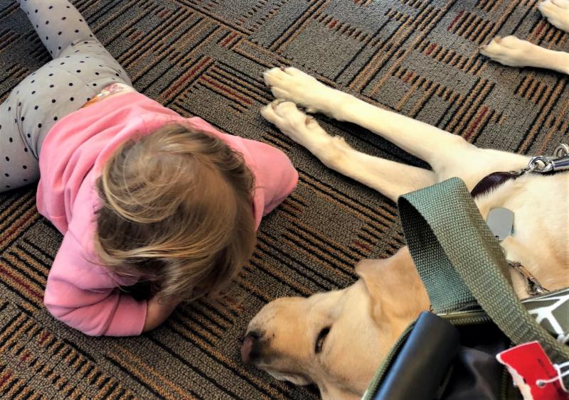 At the airport in Washington DC waiting for a return flight to Indiana, I was overwhelmed by the noise and chaos. Hundreds of people, centered on themselves and their upcoming flights, pushed this way and that with little consideration for each other. Then, three feet in front of me, a different noise broke through. The giggles of a 15-month-old child sparkled like a star in the midnight sky. Mixed with the giggles were barks belted out in the same delighted, blissful tones! A child, waiting with her parents for a flight to Ohio, had seen Nacho! For five minutes, she embodied pure joy as she befriended my dog. No words were exchanged, just happy vocalizations and gentle pats, snuggles, and kisses. Everyone who saw or heard the relationship blooming on the floor of Gate 40 slowed and let go of their urgency. For five minutes, the right things mattered and every man, woman, child, and dog smiled.