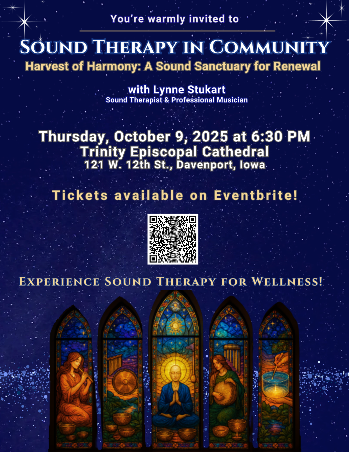 On Thursday, October 9, 2025, at 6:30 PM, join award-winning musician and certified sound therapist Lynne Stukart for an enchanting evening of sound, rest, and renewal. Together, we will honor the gifts of body, mind, and spirit, journeying into the wellness embrace of vibration, resonance, and frequency.Step into a luminous sound sanctuary where vibration is more than heard—it is felt. With the body made up of over 70% water and sound traveling 4.5 times faster in water than air, healing frequencies flow through you like threads of light, dissolving tension, quieting the mind, and guiding you gently home to yourself.This is more than a sound bath - it includes the power of using intentions for healing, chakra balancing, and the ability to journey for a deeper experience.