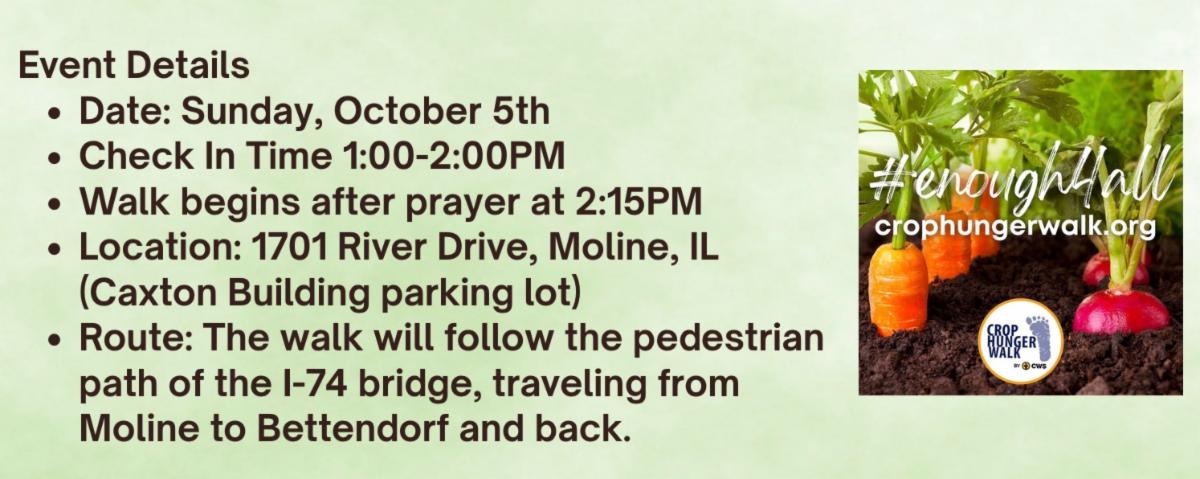 The Crop Hunger Walk is on Sunday October 5th. Our Trinity team is badly needing walkers and donations to sponsor our walkers. There are posters in the Great Hall and on the cloister doors. The walk is about 2 miles over the I 74 bridge starting in Moline, this is a very worthwhile national organization feeding the hungry around the world and locally.