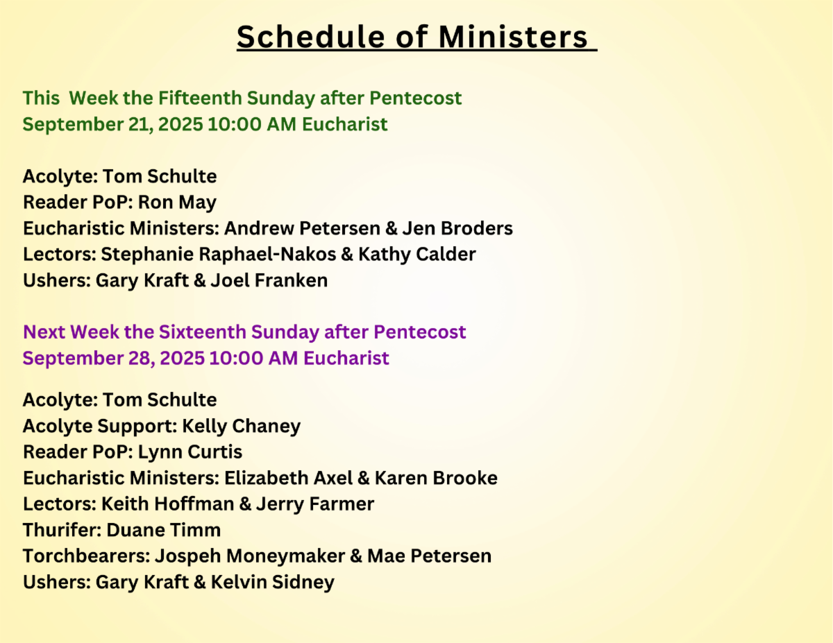 - Morning Prayer 8:30 AM & Bible Study 9:00 AM on Saturdays via zoom.