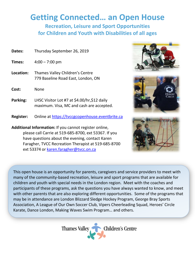 This open house is an opportunity for parents, caregivers and service providers to meet with many of the community-based recreation, leisure and sport programs that are available for children and youth with special needs in the London region. Meet with the coaches and participants of these programs, ask the questions you have always wanted to know, and meet with other parents that are also exploring different opportunities. Some of the programs that may be in attendance are London Blizzard Sledge Hockey Program, George Bray Sports Association, A League of Our Own Soccer Club, Vipers Cheerleading Squad, Heroes’ Circle Karate, Dance London, Making Waves Swim Program… and others.