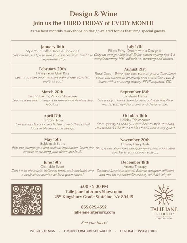 Join us at the Talie Jane Interiors showroom to explore exciting design topics while you browse. Scroll down to see what events you won’t want to miss!