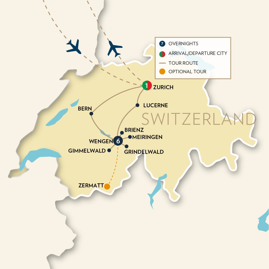 Zurich, Bern, Interlaken, Grindelwald, Gimmelwald, Murren, Lake Brienz cruise, wood carving school, Lucerne city tour