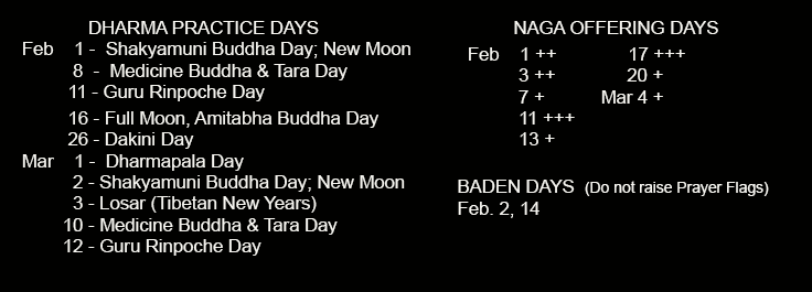 During the last month (12th) of the Tibetan Year, Nagas are guarding and holding their treasures. If you make offerings to them on one of the Naga Offering Days listed below, they will come under your command and will grant your wishes. If you make offerings to them on any other day, then no matter how good your offering is, they will think it is bad and there will be no result.