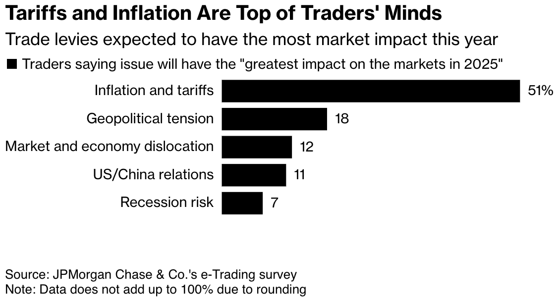 Global financial-market turbulence this week sparked by a series of US tariff announcements looks like just the beginning of a volatile year, according to a JPMorgan Chase & Co. electronic trading survey. Inflation and tariffs will have the biggest impact on markets in 2025, followed by geopolitical tension, according to the annual trading poll. Some 41% surveyed highlighted volatility as their biggest anticipated daily trading challenge, up from 28% last year. (Bloomberg Markets | Feb 6)