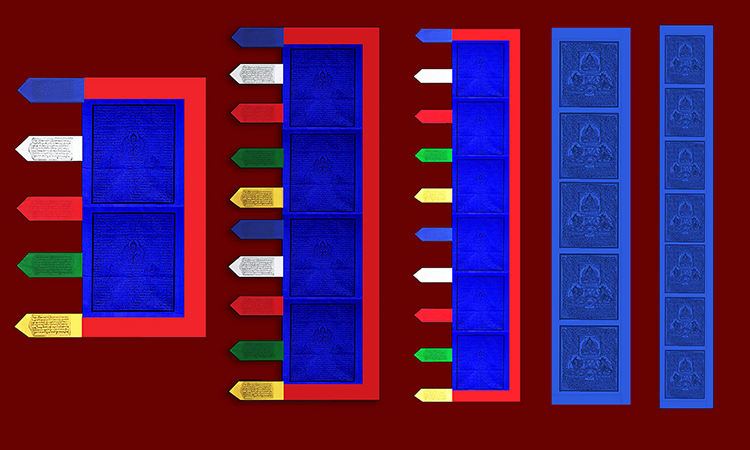 Our Health & Longevity Prayer Flags have drawings of the 3 Tse Lha Nam Sum deities surrounded by the Tse Lha Nam Sum Sutra for Long Life printed in Tibetan script.