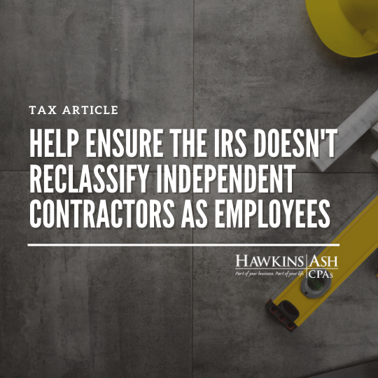 Many businesses use independent contractors to help keep their costs down. If you’re among them, make sure that these workers are properly classified for federal tax purposes. If the IRS reclassifies them as employees, it can be a costly error.