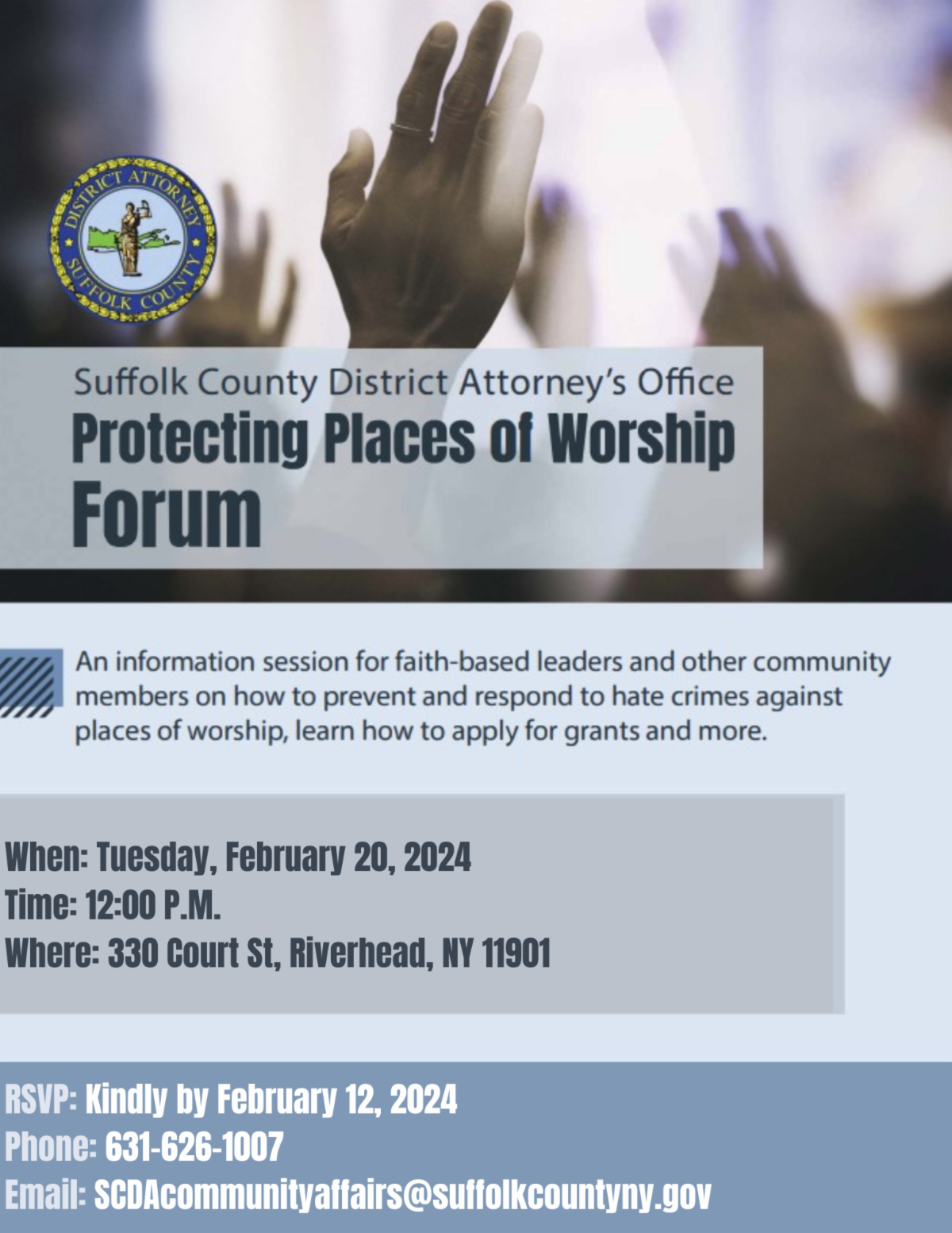 RSVP by February 12th, 2024 by calling 631-626-1007 or emailing SCDAcommunityaffairs@suffolkcountyny.gov