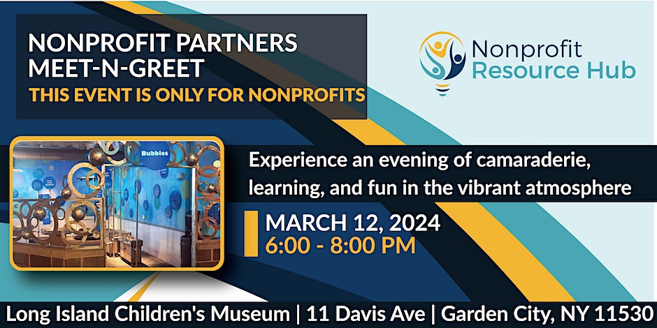 Join the Nonprofit Resource Hub for their next NRH Meet & Greet Event on March 12th from 6-8PM at the Long Island Children’s Museum. Whether you’re looking for networking opportunities, collaboration possibilities, or simply want to engage in insightful conversations, this event promises to be enriching for all. Experience an evening of camaraderie, learning, and fun in the vibrant atmosphere of the Long Island Children’s Museum. Enjoy light fare, and refreshments, and explore the museum’s captivating exhibits. * Note In order to attend this event, you must be, either, a nonprofit organization. | |