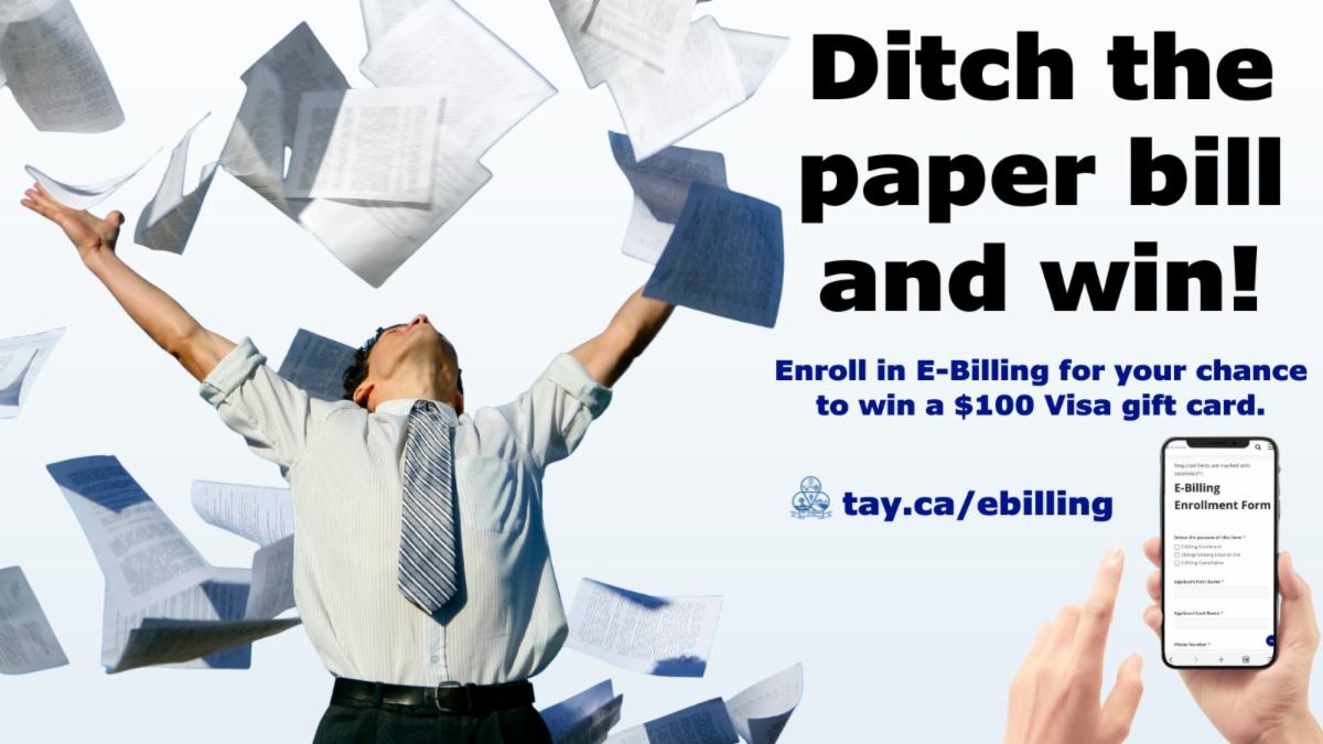 Beginning November 3, Tay Township residents who are enrolled in E-Billing for their property tax and/or water/wastewater accounts will be entered into monthly draws to win a $100 Visa gift card.