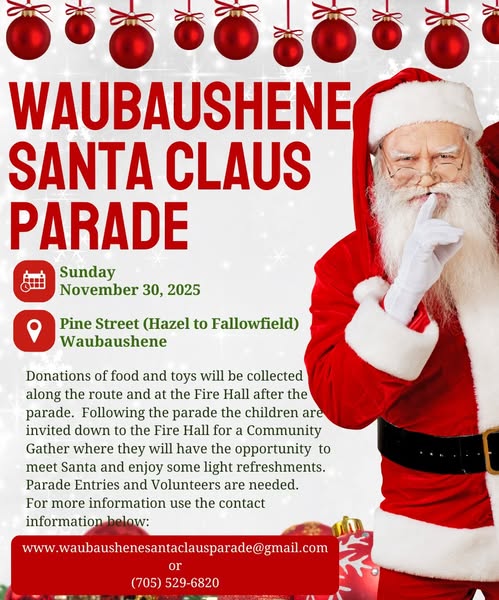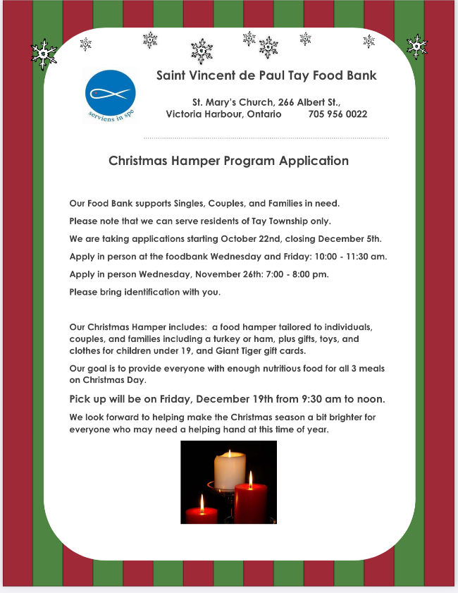 | | Saint Vincent de Paul Tay Food Bank Christmas Hamper Applications | | Upcoming Community Events | | Tay Fire Department Toy & Food Drive | | Port McNicoll Lions Club Skate for Toys | | Waubaushene Santa Claus Parade | | Waubashene & Victoria Harbour Legions | | |
