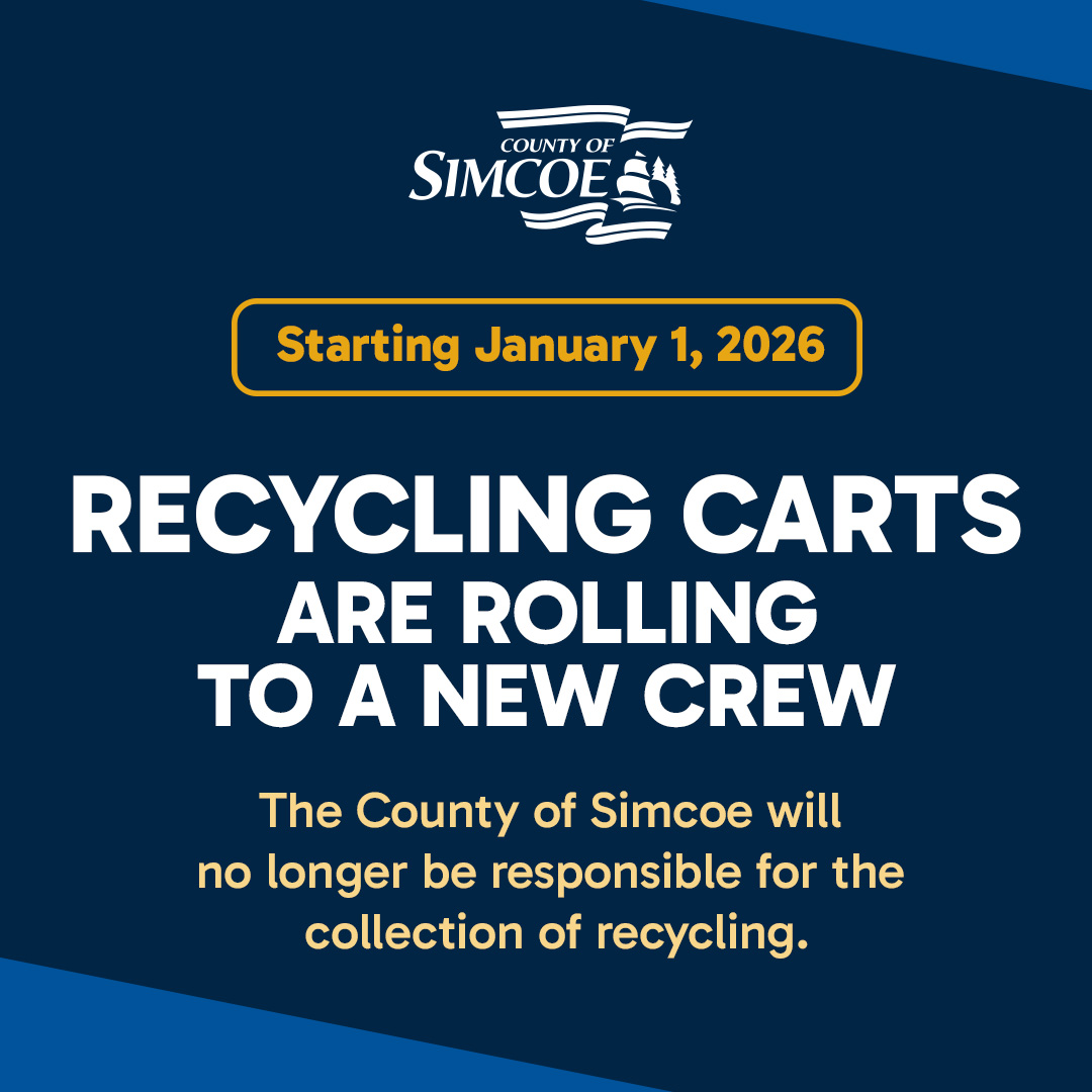 Circular Materials will oversee recycling services for single family residential units. The County of Simcoe will continue to provide garbage and organics collection, as well as operate local waste drop-off facilities as usual. For more details, visit simcoe.ca/recyclingchange.