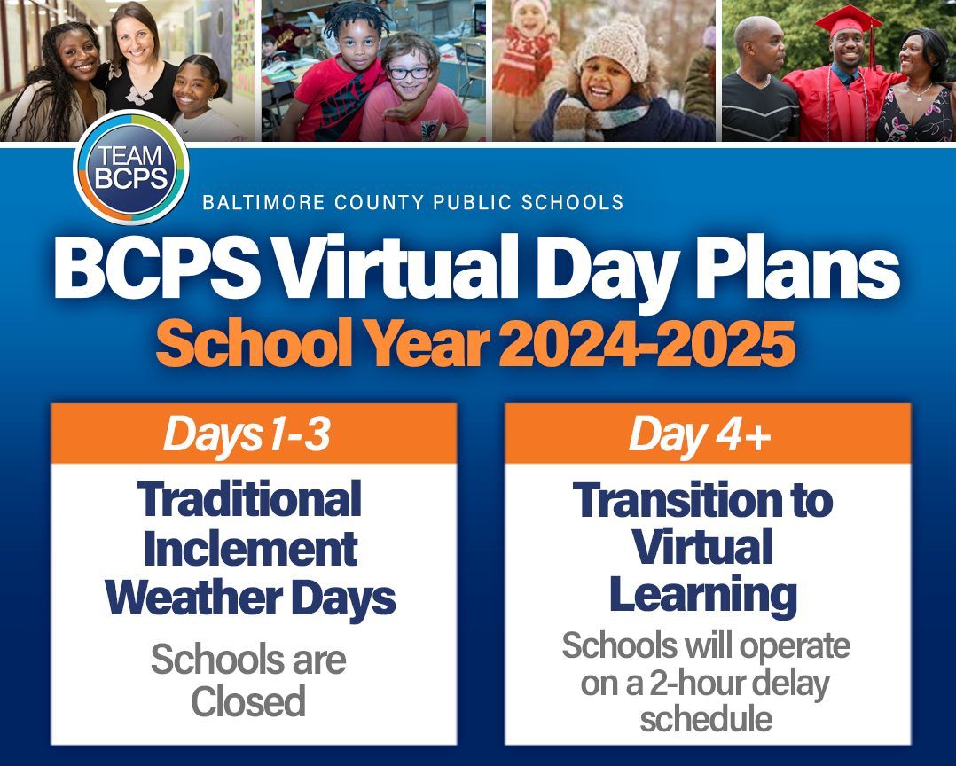 BCPS has now used two out of its three traditional inclement weather days for the 2024-25 school year. After day three, BCPS will transition to virtual learning, operating on a two-hour delay schedule. More information is available on the BCPS website.