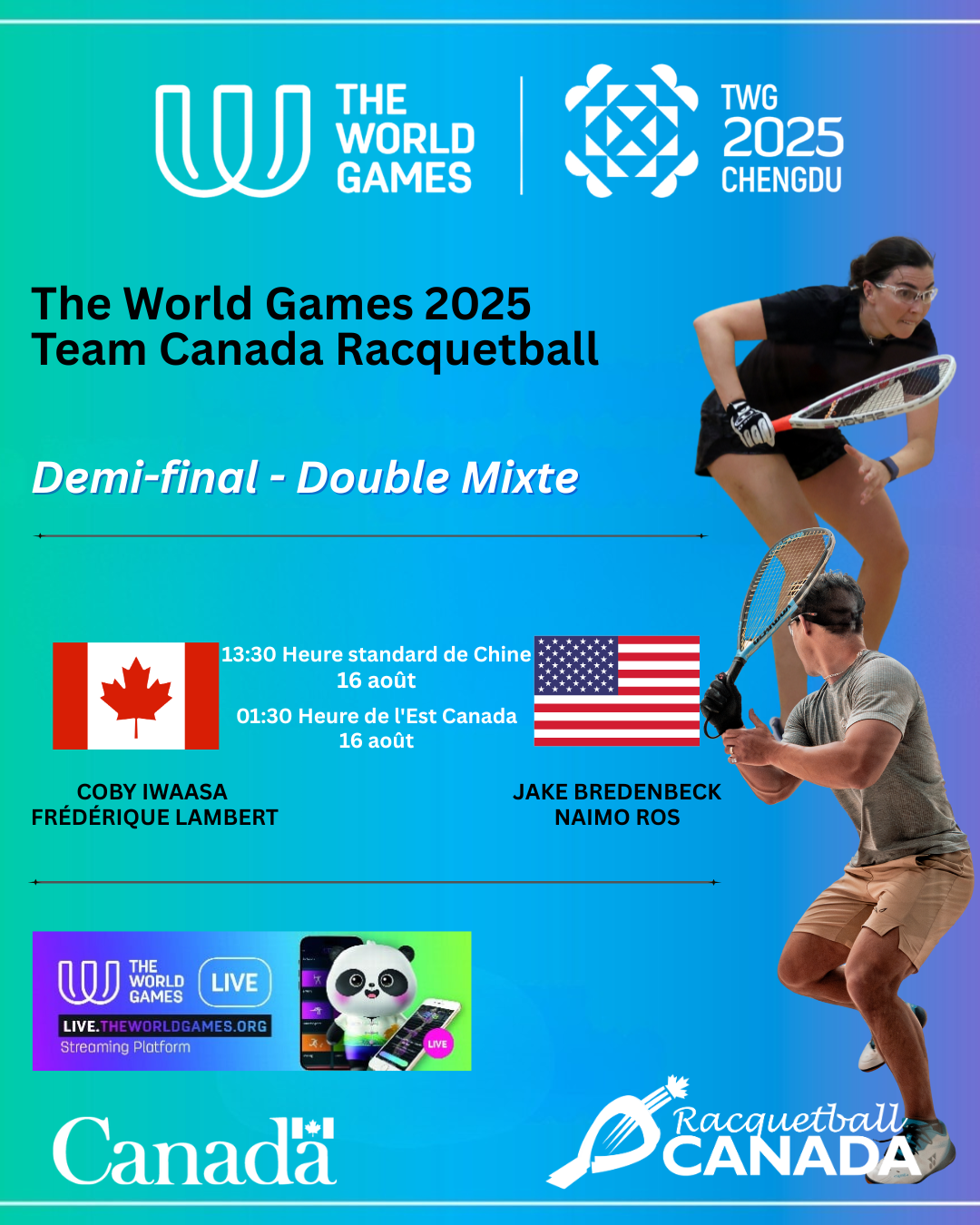 Grâce à cette victoire, le Canada se rapproche du podium et disputera désormais les demi-finales pour tenter de remporter la médaille d'or des Jeux mondiaux. Le Canada affrontera ensuite Jake Bredenbeck et Naomi Ros des États-Unis le 16 août à 13 h 30, heure normale de Chine (1 h 30, heure de l'Est).