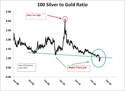 - The silver to gold ratio hit a new low and probably has bottomed. Higher silver and gold prices lie ahead.