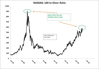 - The silver to NASDAQ ratio shows that silver prices can rally by a large factor in the next five years. NASDAQ prices can fall a long way.