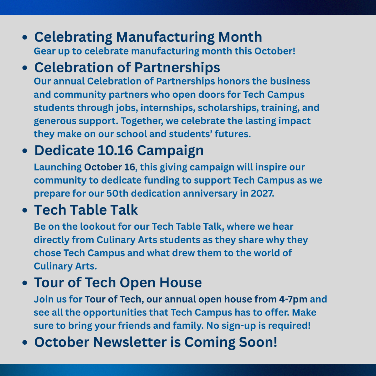 Through the Give Me TEN + TECH50 work-based learning program, students gain real-world experience at 50 partner sites with leading employers across the region. The department also shines with projects like the student-built raffle car, which not only showcases student craftsmanship but also raises thousands of dollars each year to fund scholarships and program growth.