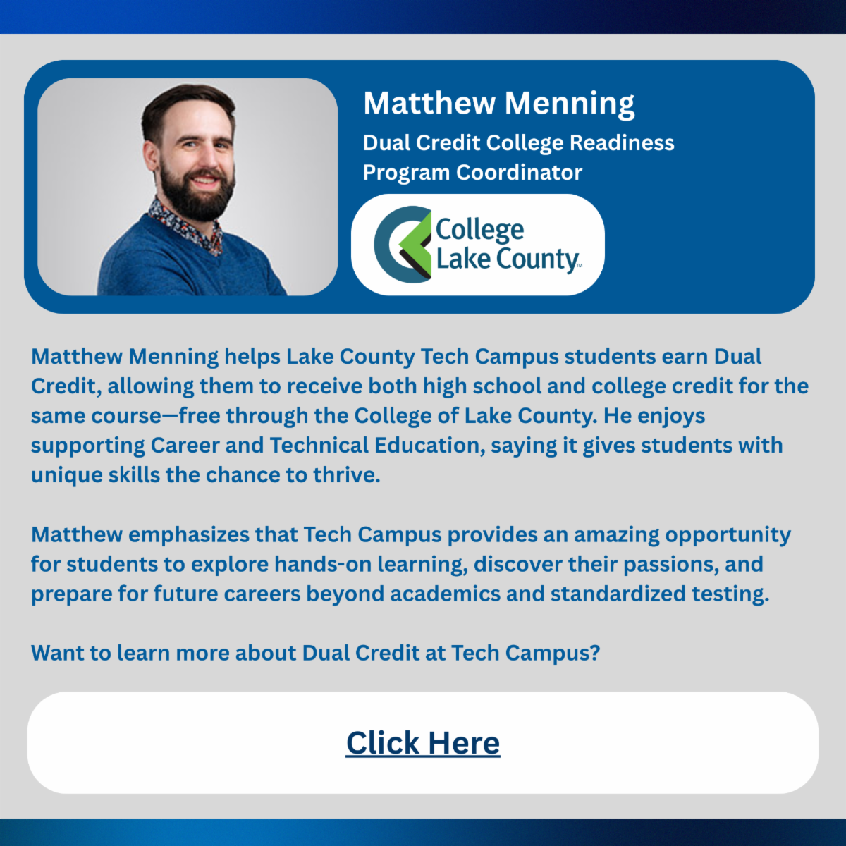 Guided by industry-trained instructors, students in the Automotive Department can earn dual credit in partnership with the College of Lake County, as well as industry-recognized certifications such as ASE (Automotive Service Excellence) and I-CAR (Inter-Industry Conference on Auto Collision Repair). These credentials, combined with real-world experiences, ensure that every Tech Campus automotive student graduates with the knowledge, skills, and confidence to succeed in a fast-changing industry.