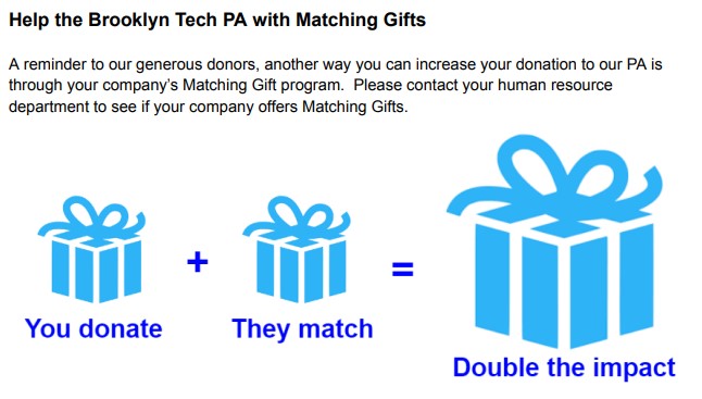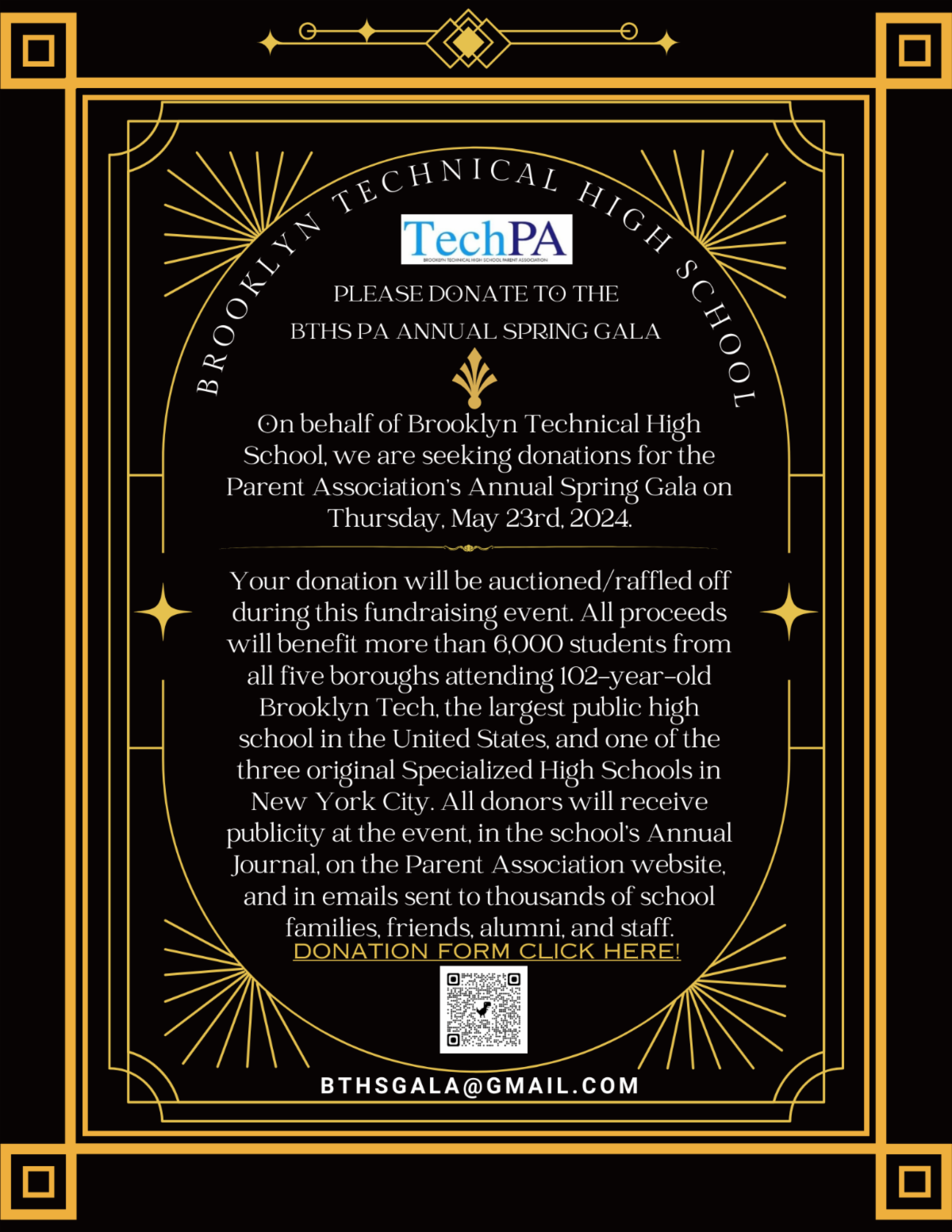 The Brooklyn Tech PA needs your help to provide critical funding for our students’ academics, extracurricular activities, and supplies. Our goal for the 2023-2024 school year is to raise $400,000 to support our 6,000+ student body. We have raised nearly 60% of our goal, but only 15% of families have donated.