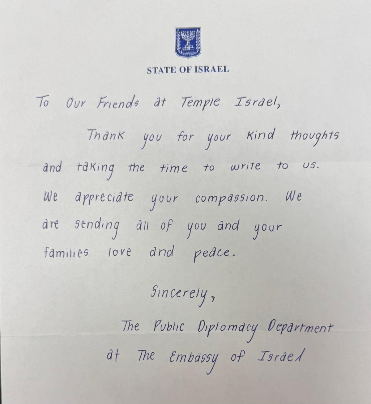 | | On May 23, people attending our Shabbat service (and others) signed a card to the Israeli Embassy staff in Washington, DC following the terrorist attack that killed two of its employees who were attending an event with the local Jewish community. You can see the original card by clicking here. | | |