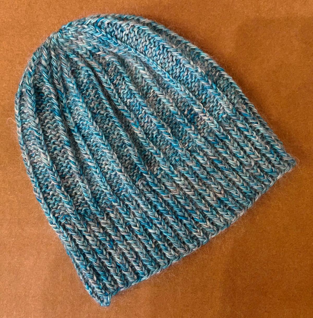 , by Espace Tricot, is an easy hat pattern featuring a twisted rib stitch pattern. This simple stitch creates an interesting texture while allowing beautiful yarns to take center stage. The original pattern is knit with two strands of fingering weight yarn and one strand of a lace weight mohair blend - all held together. However it is possible to eliminate the mohair. Also, knitters will find additional instructions for a “faded” version.