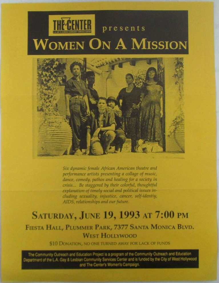 The Center Presents Women on a Mission. (L.A. Gay and Lesbian Community Services Center) Saturday June 19, 1993 Event Flyer. L.A. Gay and Lesbian Community Services Center, Publisher. Los Angeles: 1993. Single sheet, 8 ½ by 11 inches. Yellow paper stock. A flyer advertising a “collage of music, dance, comedy, pathos and healing for a society in crisis.” The event featured six African American women performance and theatre artists, although the flyer does not mention who they are. The Los Angeles LGBT Center was founded in 1969 to provide the LGBTQ+ community with support in health, housing, social services and advocacy. GOOD condition. Two horizontal fold creases present. Minor wrinkling and creasing. $30.00