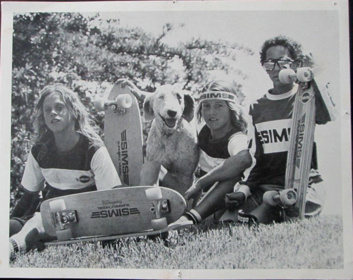 [Skateboarding] Sims Skateboards Youth Skateboarding Team (?) Members. No publisher, place or date. Presumed Sims Skateboards, publisher, California circa 1978. 8 by 10 inch photograph. Presumably a promotional photograph for Sims Skateboards, featuring three boys in Sims apparel, along with images of the Sims Superply Model skateboard and the Sims Taperkick, the latter of which first appeared in 1978. Sims skateboards was founded by legendary skater and surfer Tom Sims, whose boards helped moved skateboarding into the modern era of street and pool skating. We could not identify the young men in the picture, nor the happy dog for that matter. Either way, it’s a great image of skateboarding culture. GOOD condition. Minor toning, soiling and creasing. Several tack holes along the edges. It appears someone couldn’t decide the best way to pin this to a wall. $100.00