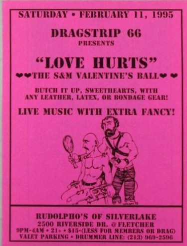 Dragstrip 66 Presents “Love Hurts” the S and M Valentine’s Ball. Saturday February 11, 1995 Handbill. Dragstrip 66, Publisher. Silver Lake, CA: 1995. Single sheet, 5 ½ by 4 inches. Pink paper stock. Promo for Dragstrip 66, a LGBTQ+ club founded in 1993, and known for its embrace of the alternative and punk scene, as well as drag. Founded by Paul Vitagliano and his friend Mr. Dan, the bar focused on drag when it was still an outlier even within the gay community. Part of their strategy was to adopt an underground, punk edge to drag, where everything from booger drag to its glamorous counterparts, were welcome. The club closed in 2013 and reopened again in 2023. (see LA ist online article for previous history and information). An advertisement for an S&M Valentine’s Ball, suggesting people, “Butch it up, sweethearts, with any leather, latex or bondage gear!” Reverse of the leaflet advertises the Plush Life, “LA’s Only Weekly Sitcom, Serial, Soap Opera!” NEAR FINE with light edgewear. $50.00